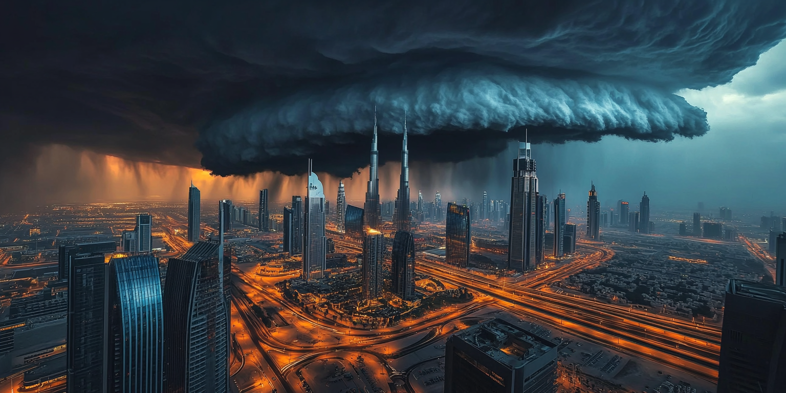 The towering Burj Khalifa, surrounded by swirling clouds, stands as a beacon of resilience amidst the chaos. The juxtaposition of modernity and nature’s raw power in these images symbolizes the delicate balance between human achievement and the unpredictable forces of the environment. The intricate details of the storm clouds, paired with the illuminated streets, draw viewers into a world that feels both fantastical and realistic.