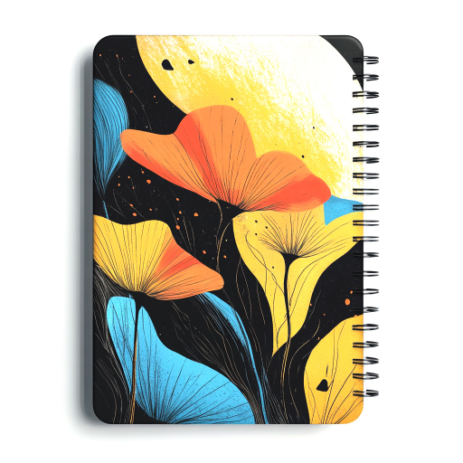 A stunning notebook collection inspired by nature’s beauty and artistic floral elements. These designs capture the essence of vivid botanical patterns, blending delicate flowers with cosmic and abstract backdrops. The color palette features warm oranges, golden yellows, deep blues, and rich black tones, creating a vibrant yet elegant visual experience.