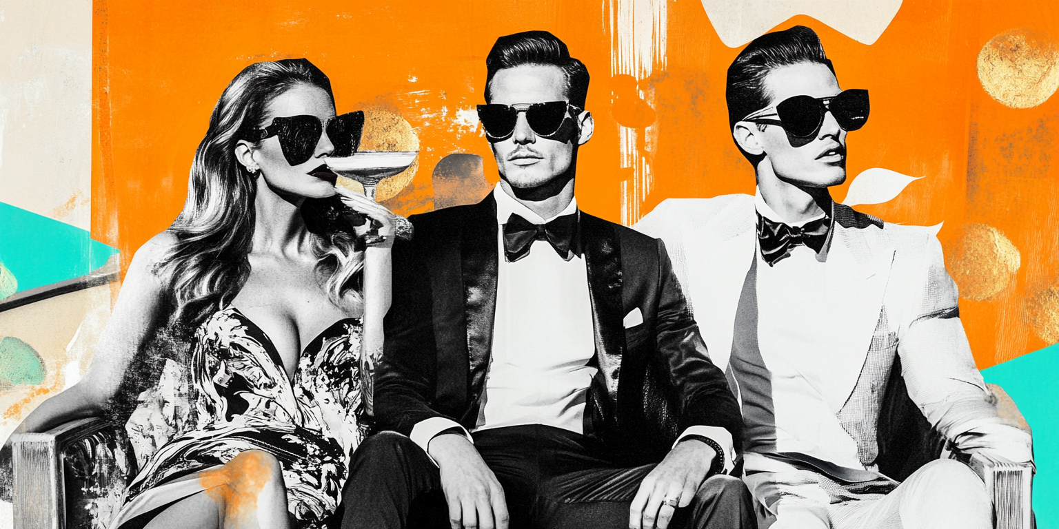 This vibrant collage exudes a stylish blend of tropical warmth and retro elegance, showcasing a sophisticated group dressed in sharp tuxedos and glamorous attire. The juxtaposition of vivid oranges and blues against the monochrome figures gives a surreal edge, as if they are icons of a bygone era brought to life in a modern paradise.