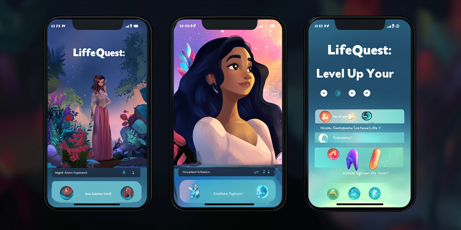 Inspired by fantasy RPGs and self-improvement apps, LifeQuest merges digital interactivity with enchanting visuals to engage users in a gamified self-growth experience. The interface is built around illustrated characters, mystical landscapes, and a soft-glowing neon aesthetic that invites players into an immersive world.