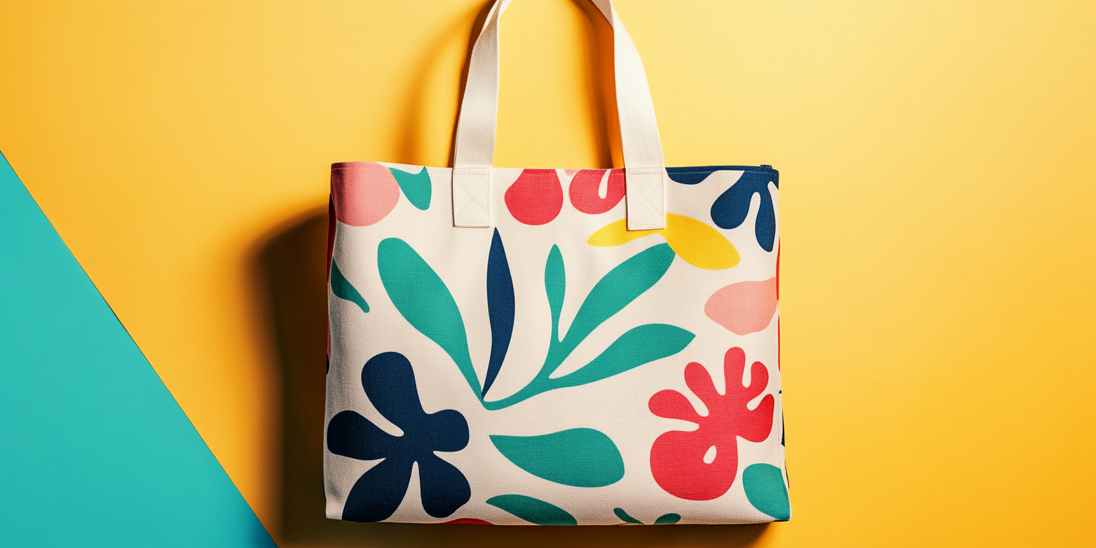 Each tote bag features abstract botanical elements in a playful mix of coral reds, deep blues, rich greens, and warm yellows. The dynamic compositions balance organic forms with modern minimalism, making these bags eye-catching yet effortlessly stylish.
